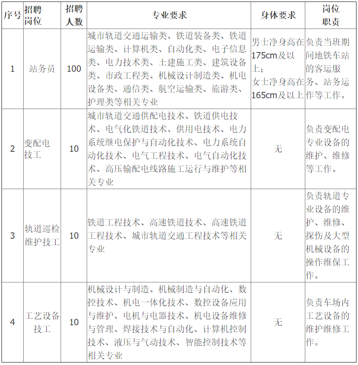 报名基本条件 1.拥护党和国家大政方针,思想品德良好,遵纪守法。 2.符合招聘岗位要求的2020届统招全日制专科毕业生。 3.无色盲色弱,身体健康,能够适应岗位工作要求。 4.大学期间所学课程补考记录不高于2门。 5.2020年8月之前取得专科毕业证。 6.热爱轨道交通事业,具有较强的事业心和责任感。